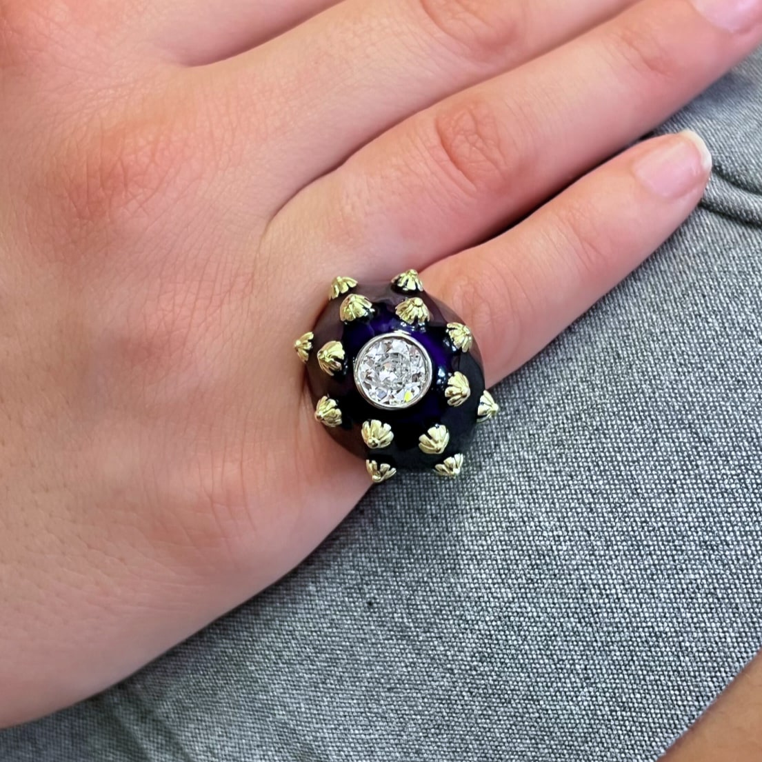 An 18 karat yellow gold, enamel and diamond ring. Designed as a dome ring of deep blue enamel centering a bezel set round brilliant cut diamond weighing approximately 0.98 carat, the enamel scattered with approximately 14 gold rosettes.