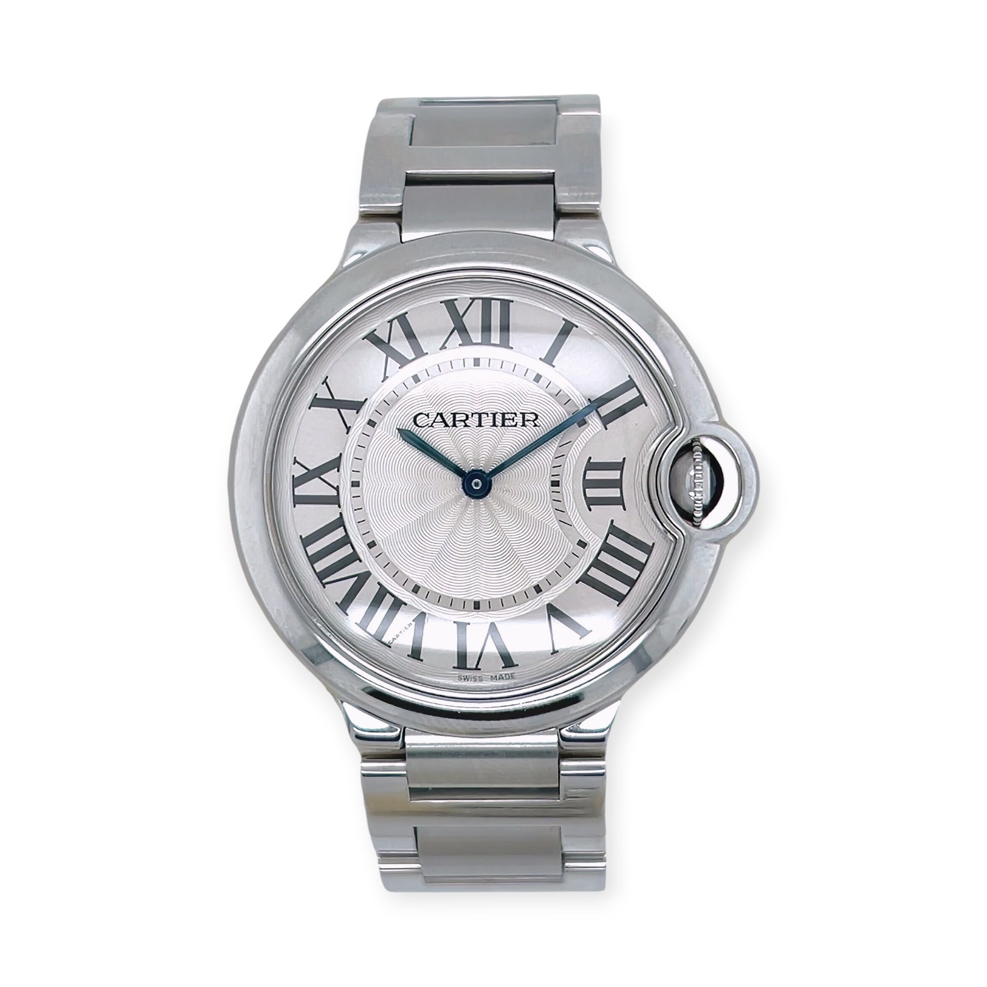 A stainless steel watch, Cartier. The Ballon Bleu watch with quartz movement, 36 mm case and Roman numerals, completed by a link bracelet with deployant clasp.