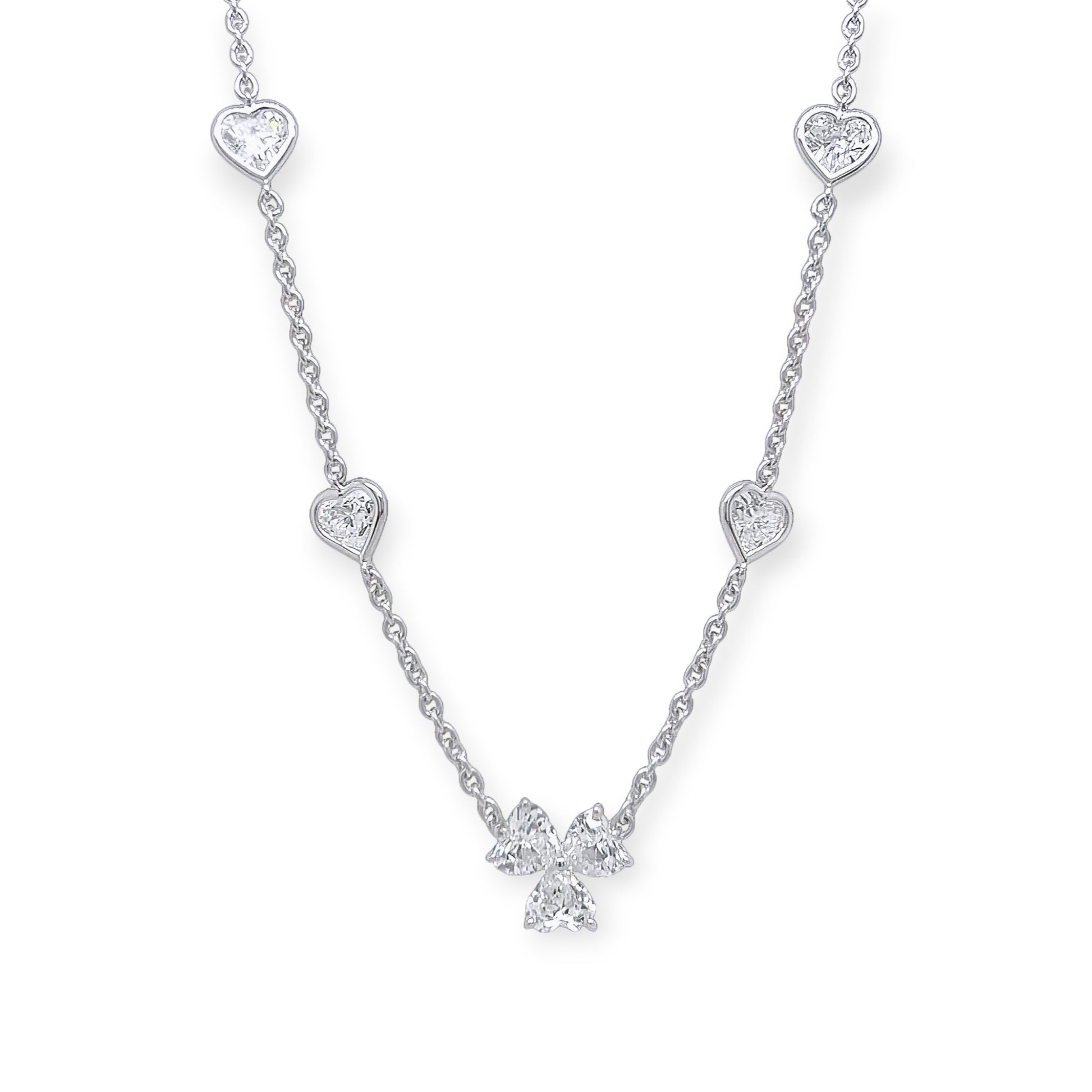 An 18 karat white gold and diamond necklace, Cartier, France. Centering a cluster of three heart shaped diamonds on a chain studded with six bezel set heart shaped diamonds.