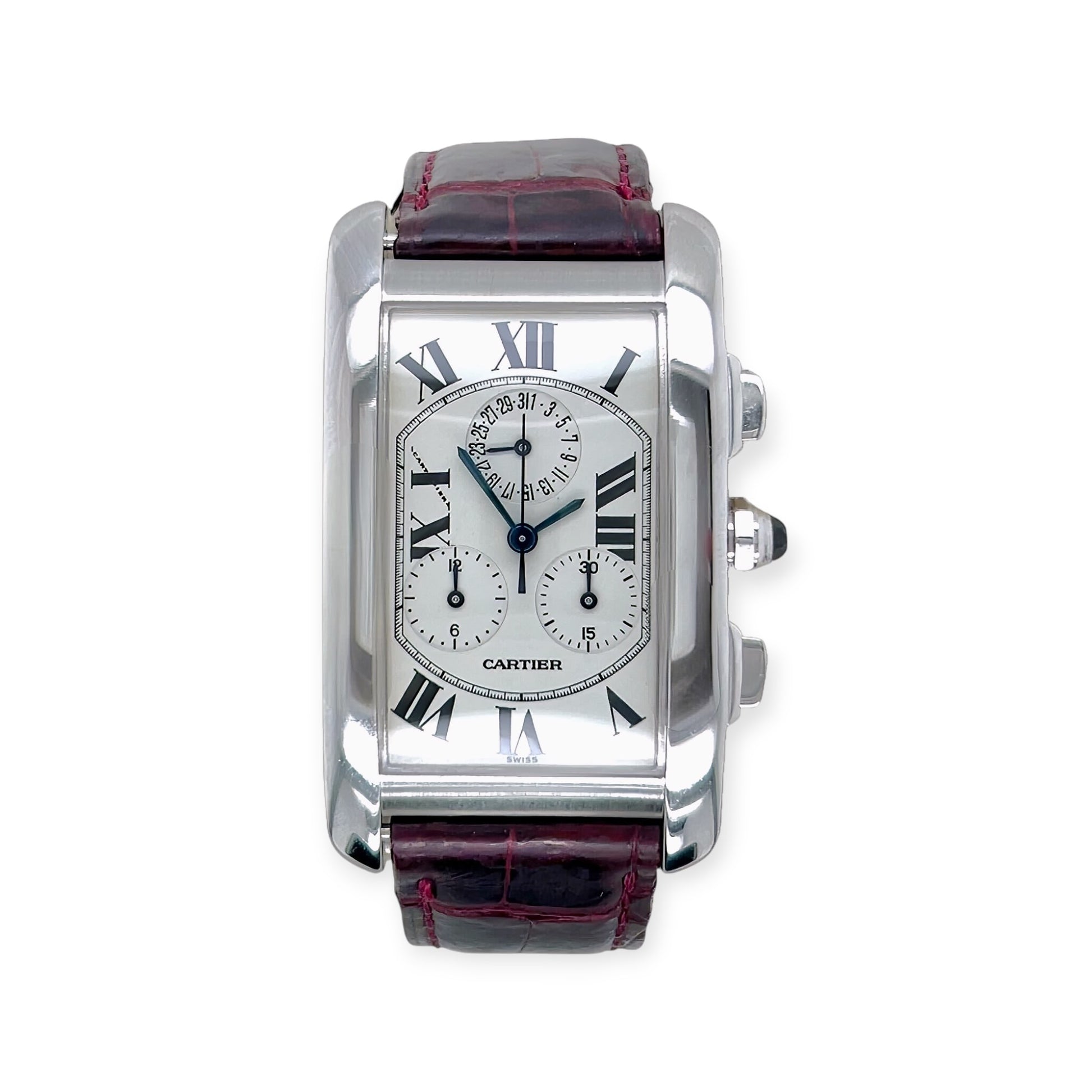 An 18 karat white gold watch, Cartier. The Tank Americaine Chronograph with quartz movement, Roman numerals and three subsidiary dials completed by an oxblood alligator strap with deployant clasp.