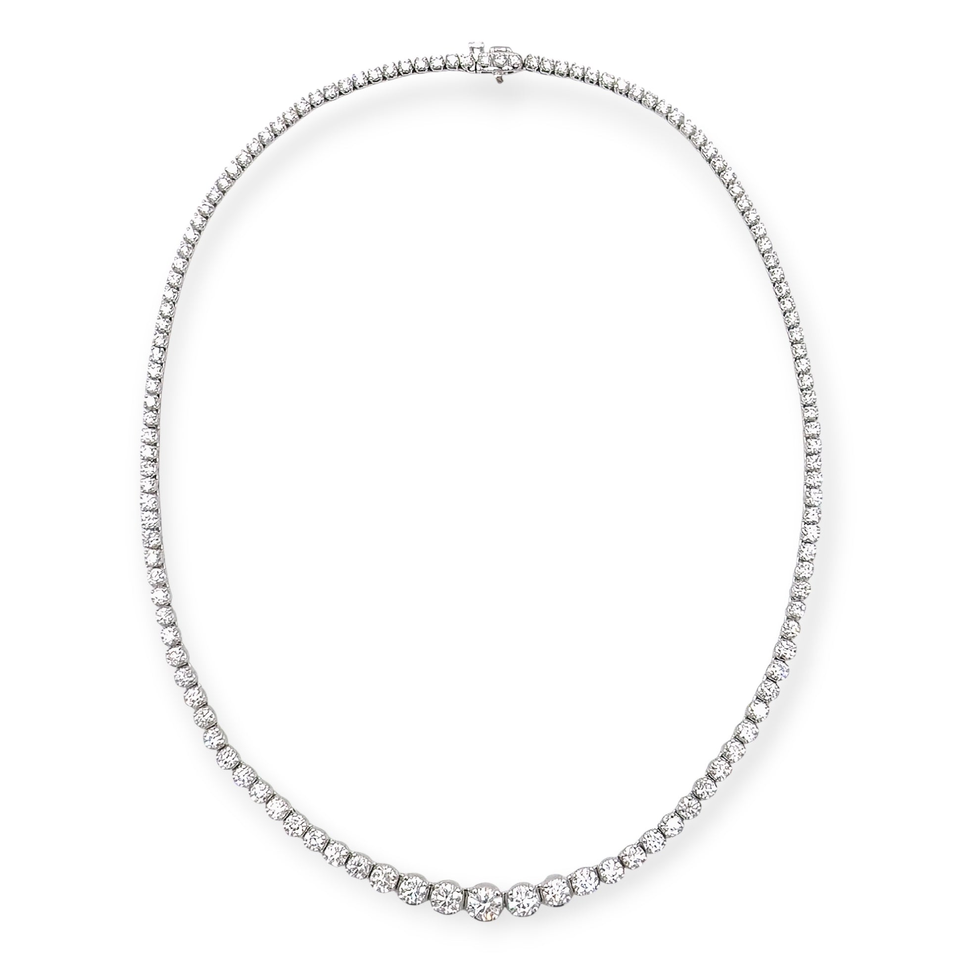 A platinum and diamond necklace. Designed as a riviere of approximately 125 graduated round brilliant cut diamonds. Total diamond weight: approximately 13.67 carats.