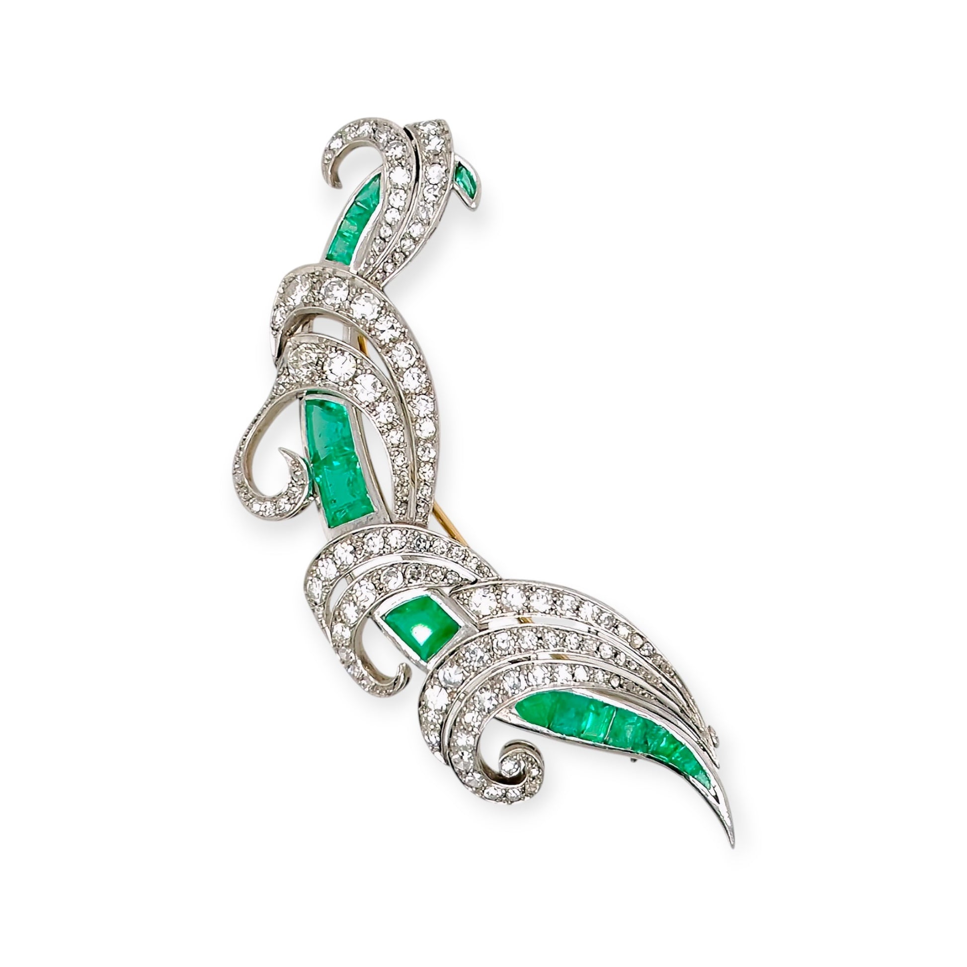 Emerald Diamond Platinum Scroll Brooch