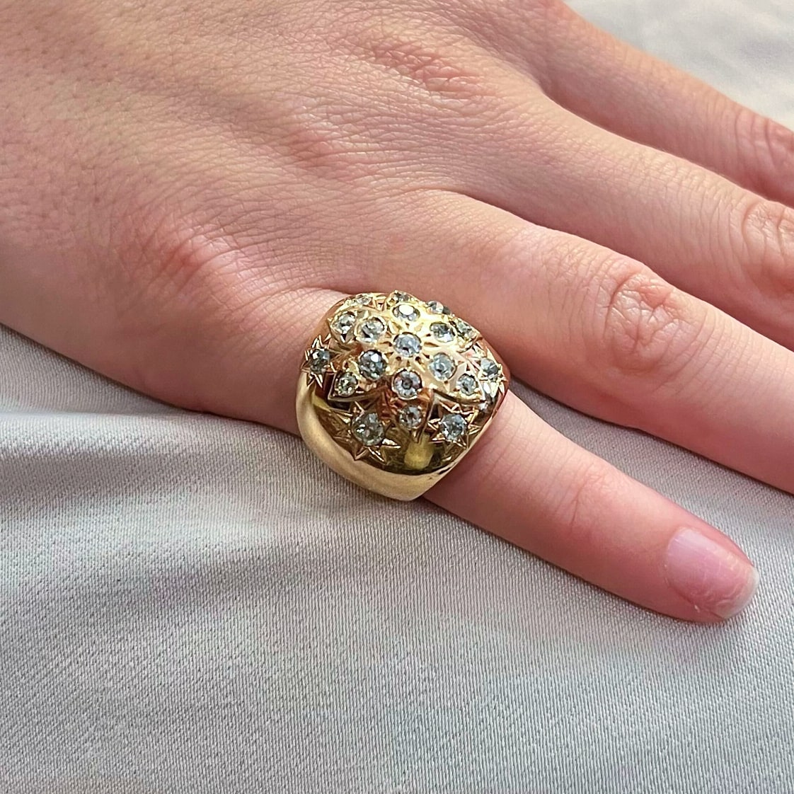 An 18 karat rose gold and diamond ring, French. Designed as a wide tapering bombe band displaying approximately 19 round brilliant cut and single cut diamonds in stylized star settings. With French hallmark.