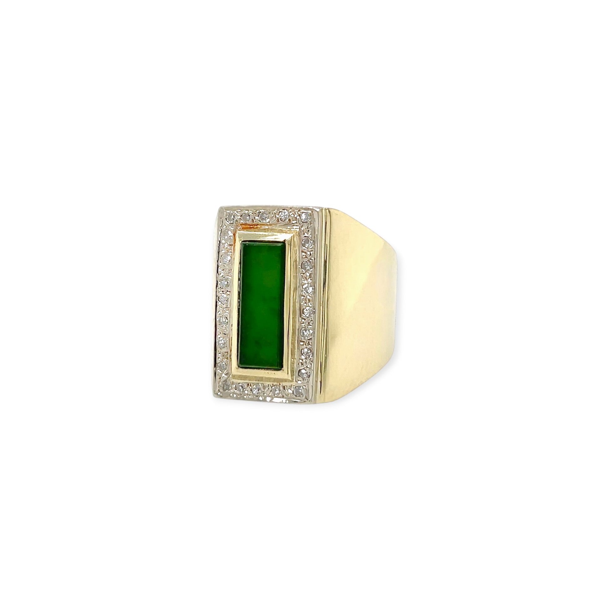 A yellow and white gold, green onyx and diamond ring. The yellow gold ring centered by a rectangular green onyx plaque, surrounded by 24 white gold set single cut diamonds.
