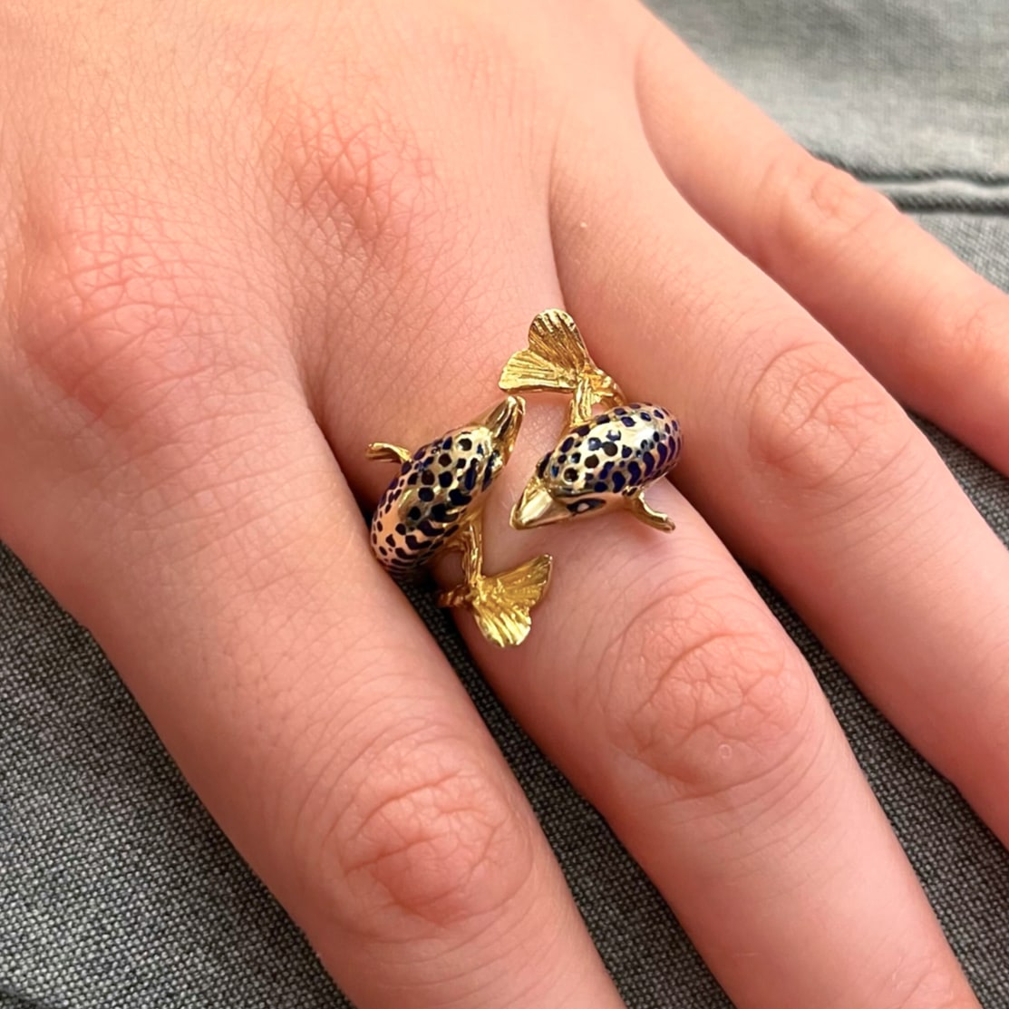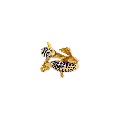A yellow gold and enamel ring. Designed in a bypass style with two opposing fish wrapped around the finger, the fish enhanced with speckles of blue enamel.