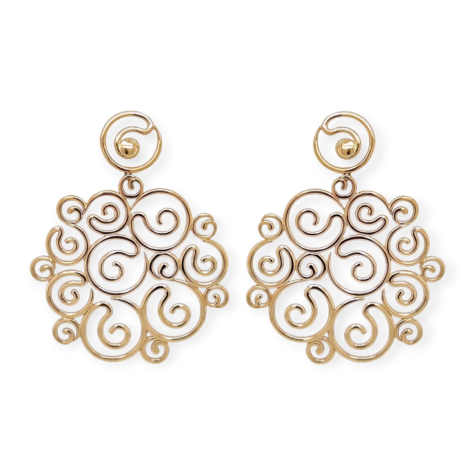 A pair of 18 karat yellow gold earrings, Italy. Each earring designed as an open circle enclosing a curlicue suspending a large drop with multiple open curlicue motifs, with post and friction back.