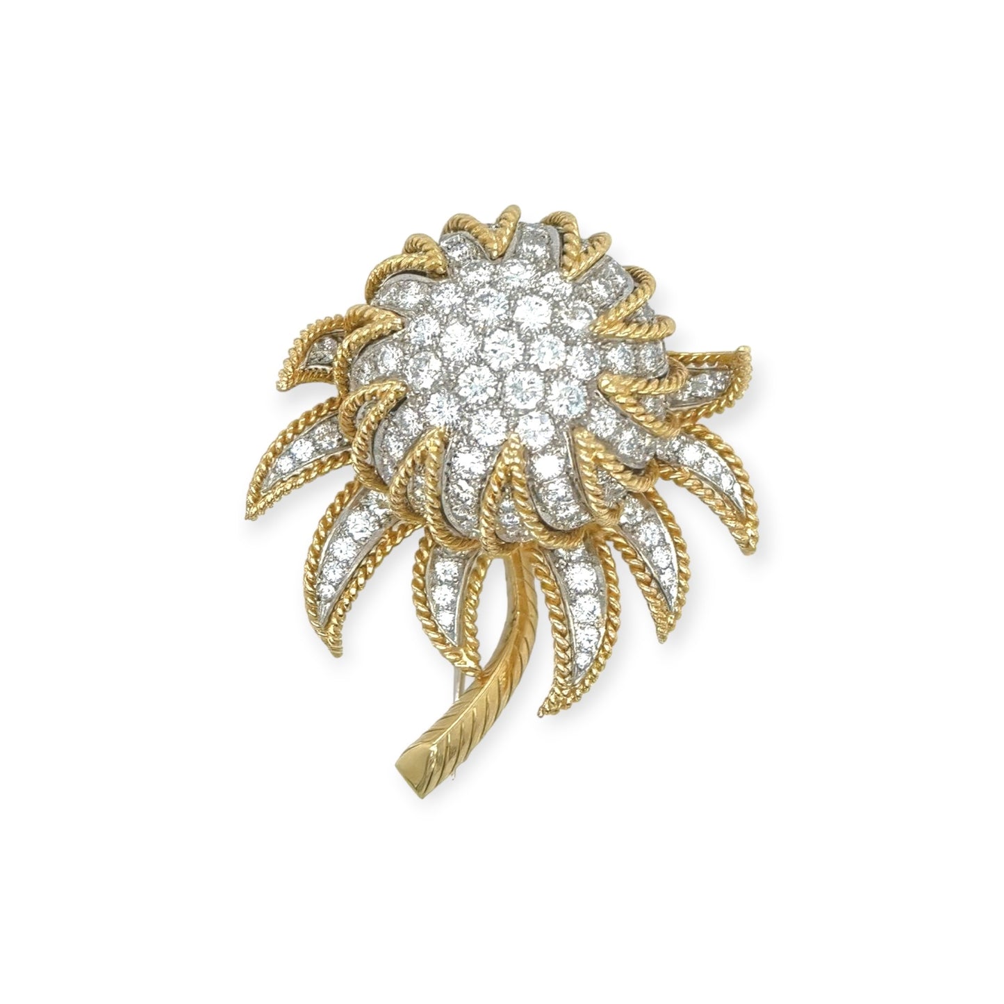 An 18 karat yellow gold and diamond brooch. Designed as a thistle set with approximately one hundred eighteen (118) round brilliant cut diamonds, with ropework outlined petals and leaves. Total diamond weight approximately 8.49 carats. Length approximately 2 1/8 inches. Gross weight approximately 39.20 grams.