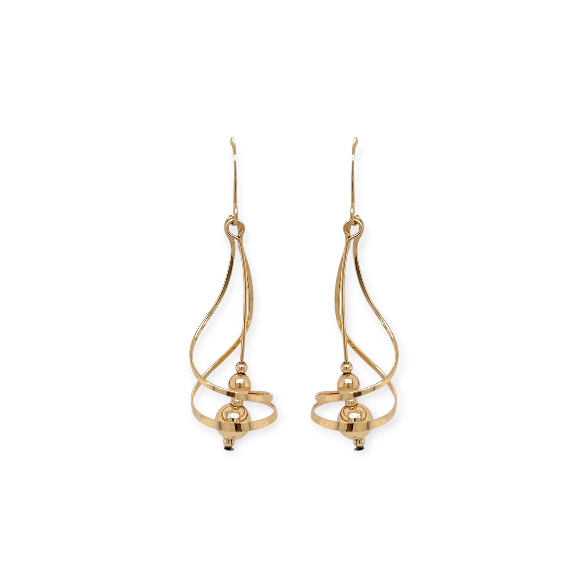 A pair of yellow gold earrings. Each earring designed as an open spiral curlicue enclosing a free hanging wire with five beads of various sizes at the bottom, both elements suspended from a wire.