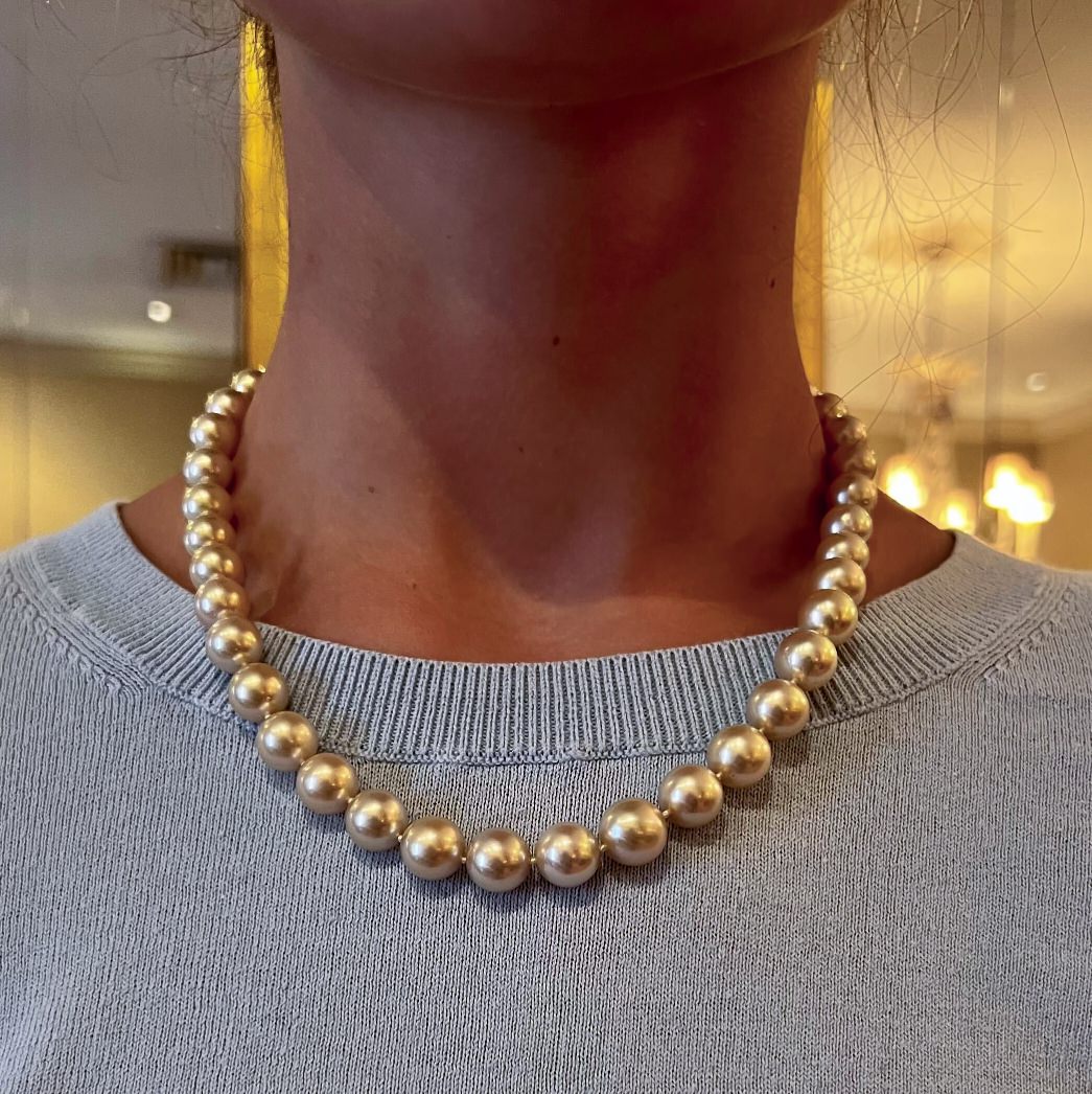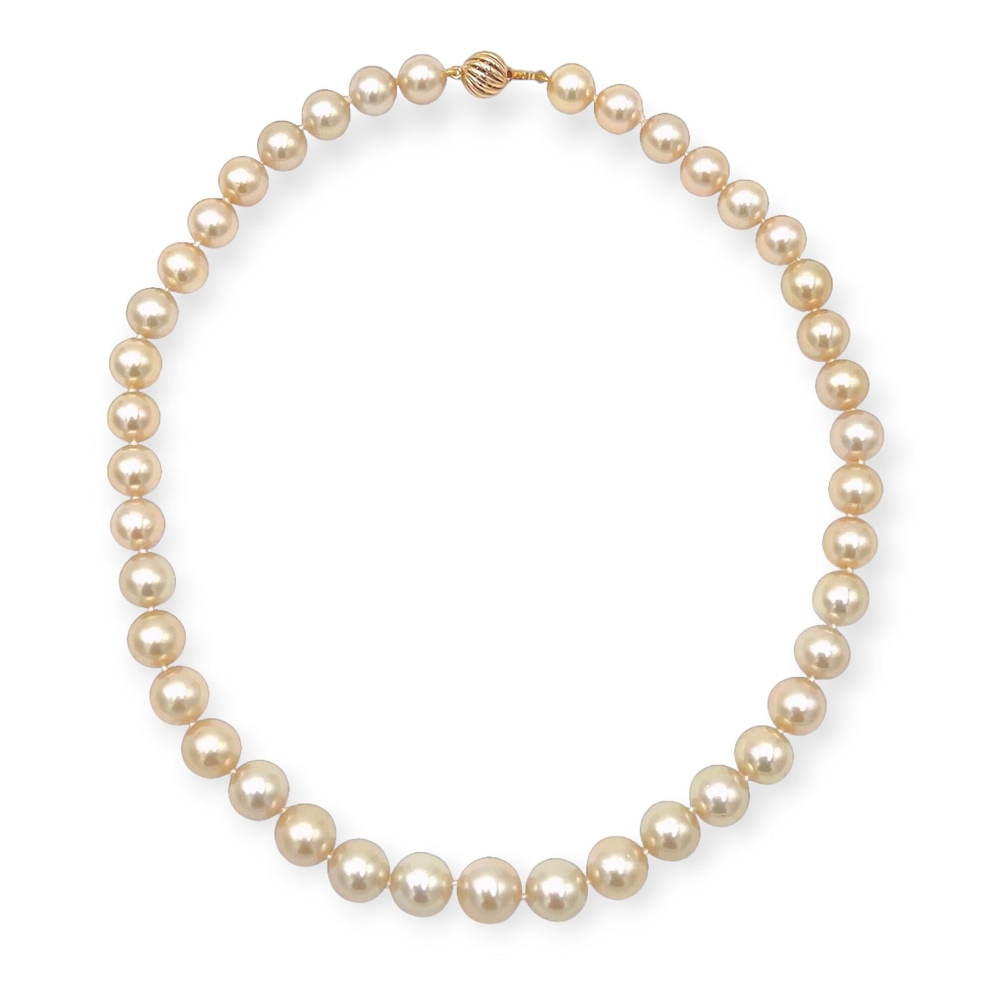 An 18 karat yellow gold and pearl necklace. Designed as a graduated strand of 41 golden South Sea pearls, ranging in size from approximately 9.9 to 12 mm, completed by an open spiraled spherical yellow gold clasp.