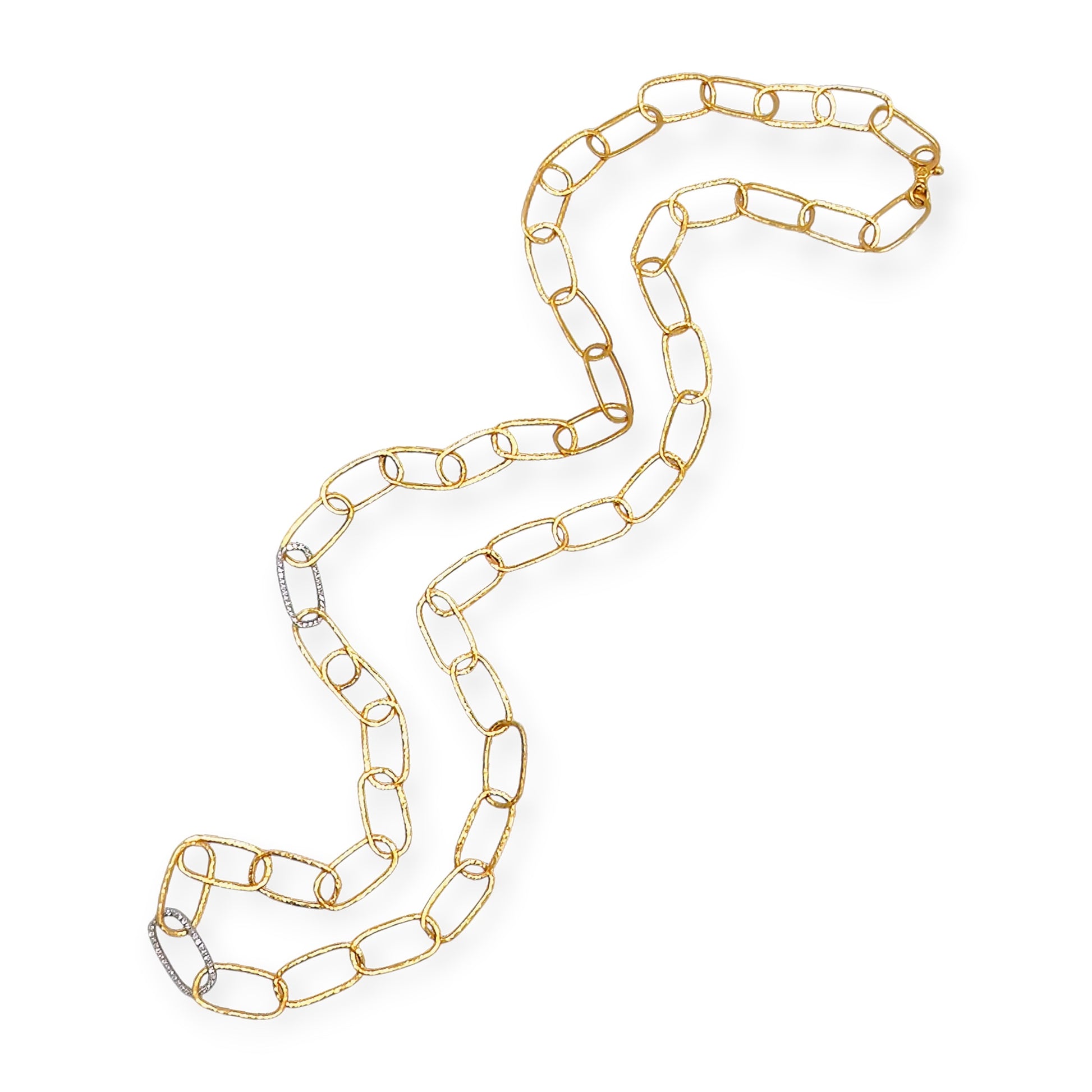 A 22 karat yellow gold, 18 karat white gold and diamond necklace, Gurhan. The Geo necklace designed as a length of yellow gold hammered oval links interspersed with two white gold links pave set with approximately 140 round brilliant cut diamonds.