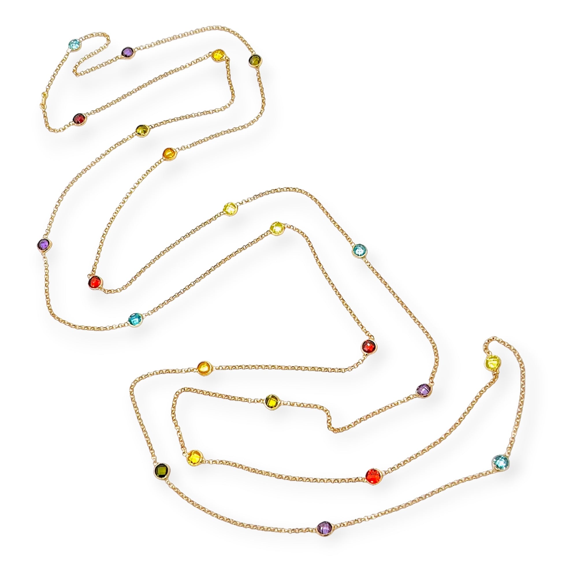 A yellow gold, garnet, blue topaz, green tourmaline, amethyst, citrine and peridot necklace. Designed as a length of cable chain displaying multiple equidistantly spaced collet set round mixed cut garnets, blue topazes, green tourmalines, amethysts, citrines and peridots.