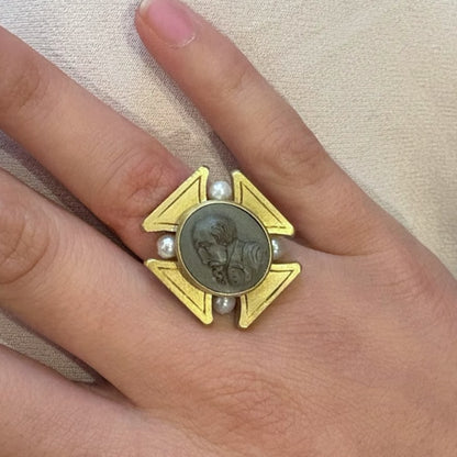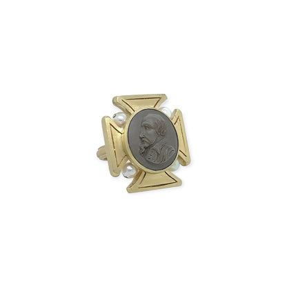 An 18 karat yellow gold, lava cameo and pearl ring. Designed as a matte gold Maltese cross centering a bezel set lava cameo depicting William Shakespeare in profile, with four (4) pearls measuring approximately 4.0 mm between the arms of the cross. Size approximately 5 1/2. Gross weight approximately 15.60 grams.