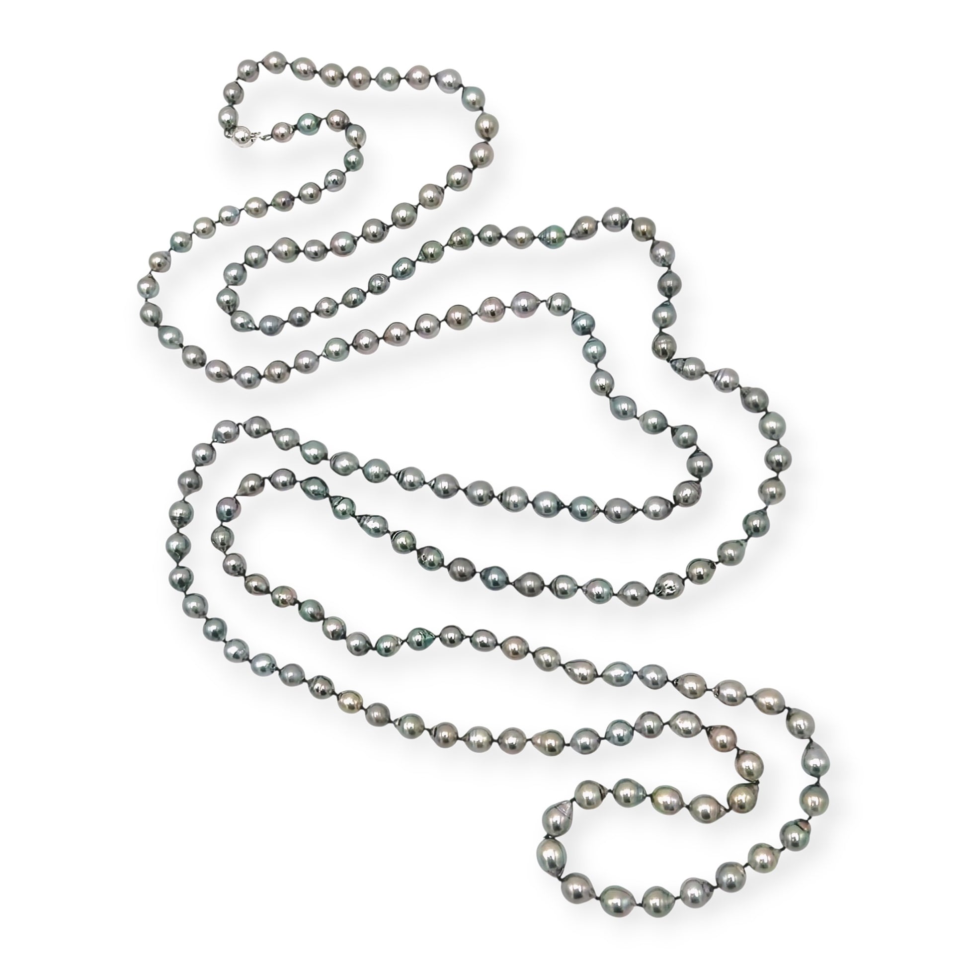 An 18 karat white gold, pearl and diamond necklace. Designed as a long strand of 177 Baroque to near round Tahitian pearls measuring between approximately 6.1 and 6.7 mm, completed by a spherical clasp set with three round brilliant cut diamonds.