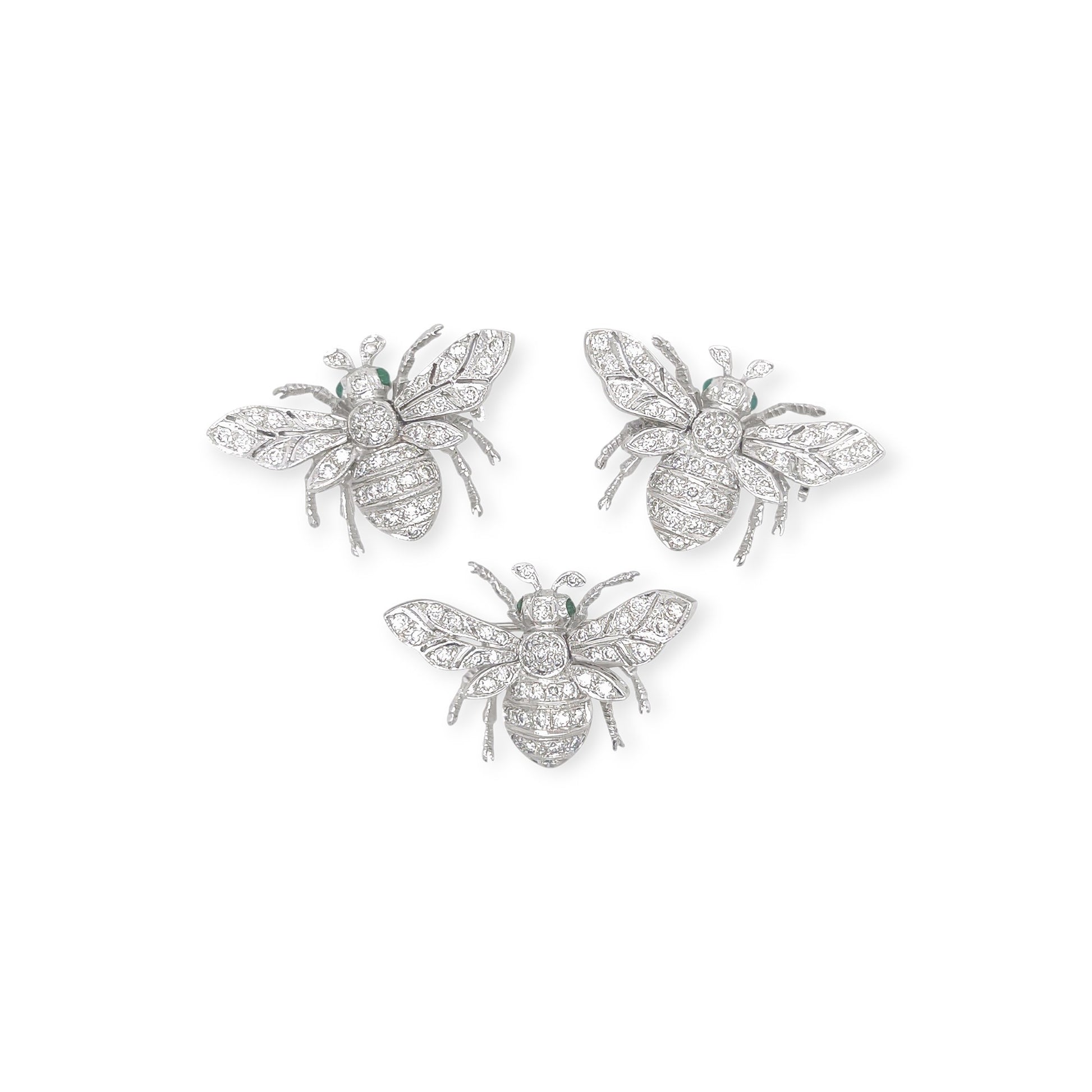 A set of three 18 karat white gold and diamond brooches. Each brooch designed as a bee set with approximately 46 round brilliant cut diamonds, with slightly moveable wings and two round cabochon emerald eyes.