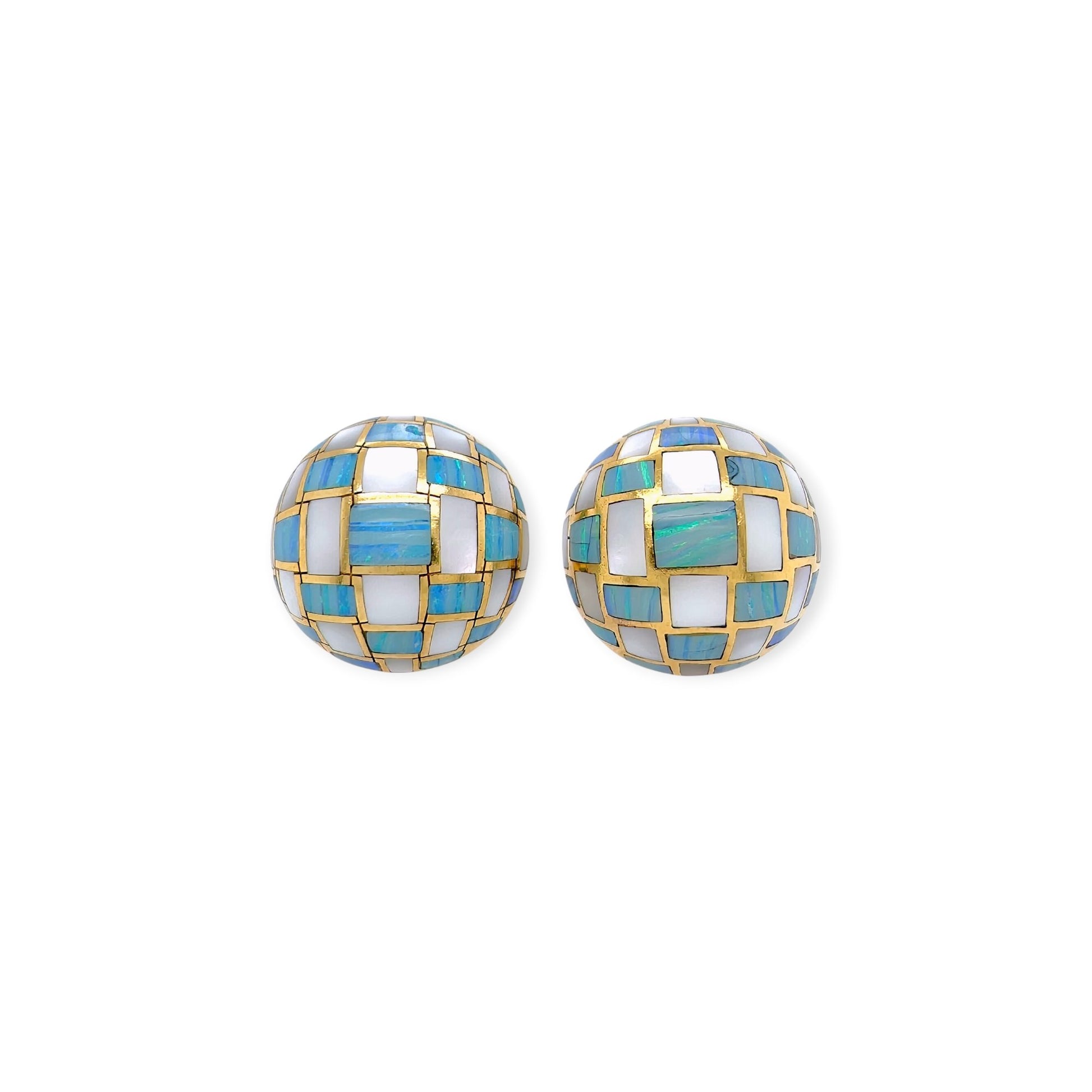 A pair of 18 karat yellow gold, mother of pearl and opal earclips, designed by Angela Cummings for Tiffany & Co. Each dome earclip decorated with a checkerboard design of opal and mother of pearl.