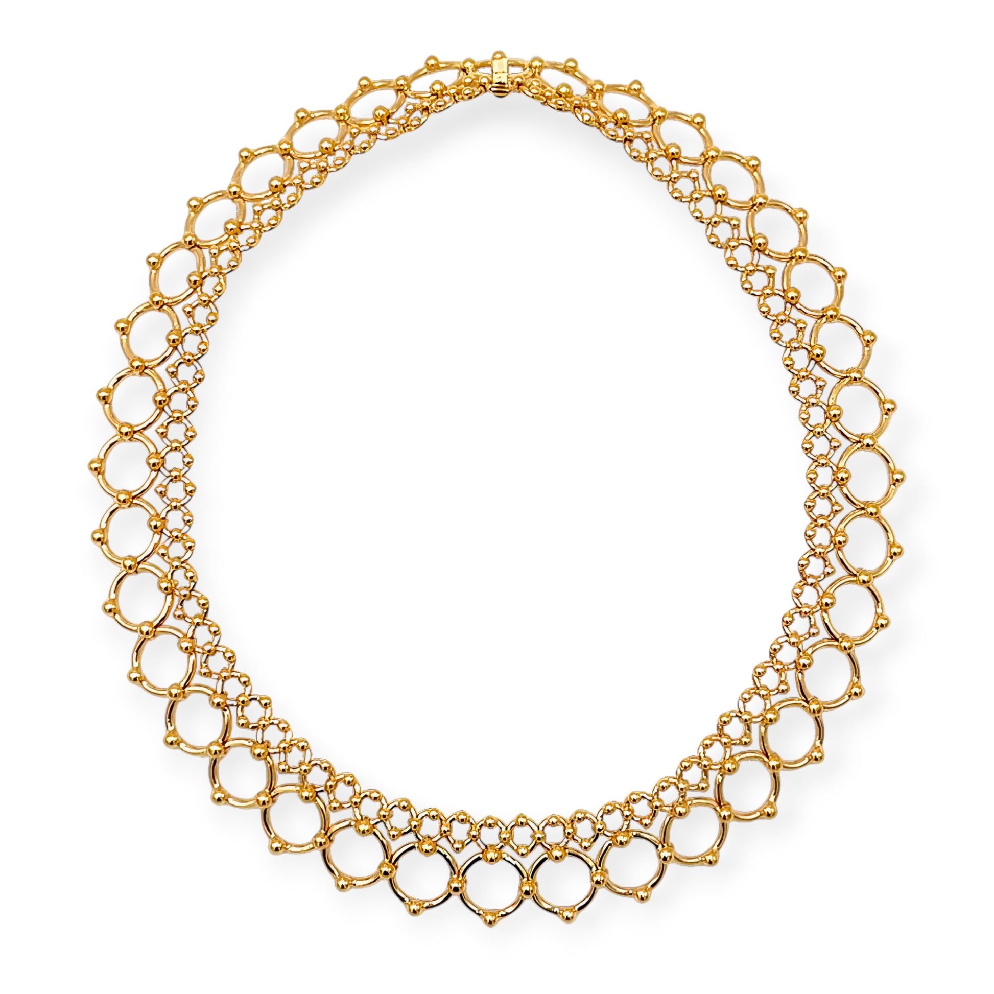 An 18 karat yellow gold necklace, Tiffany & Co. Designed as a collar in a lace motif consisting of an inner row of small circles attached by beaded loops inside a row of larger circles attached by beaded loops.