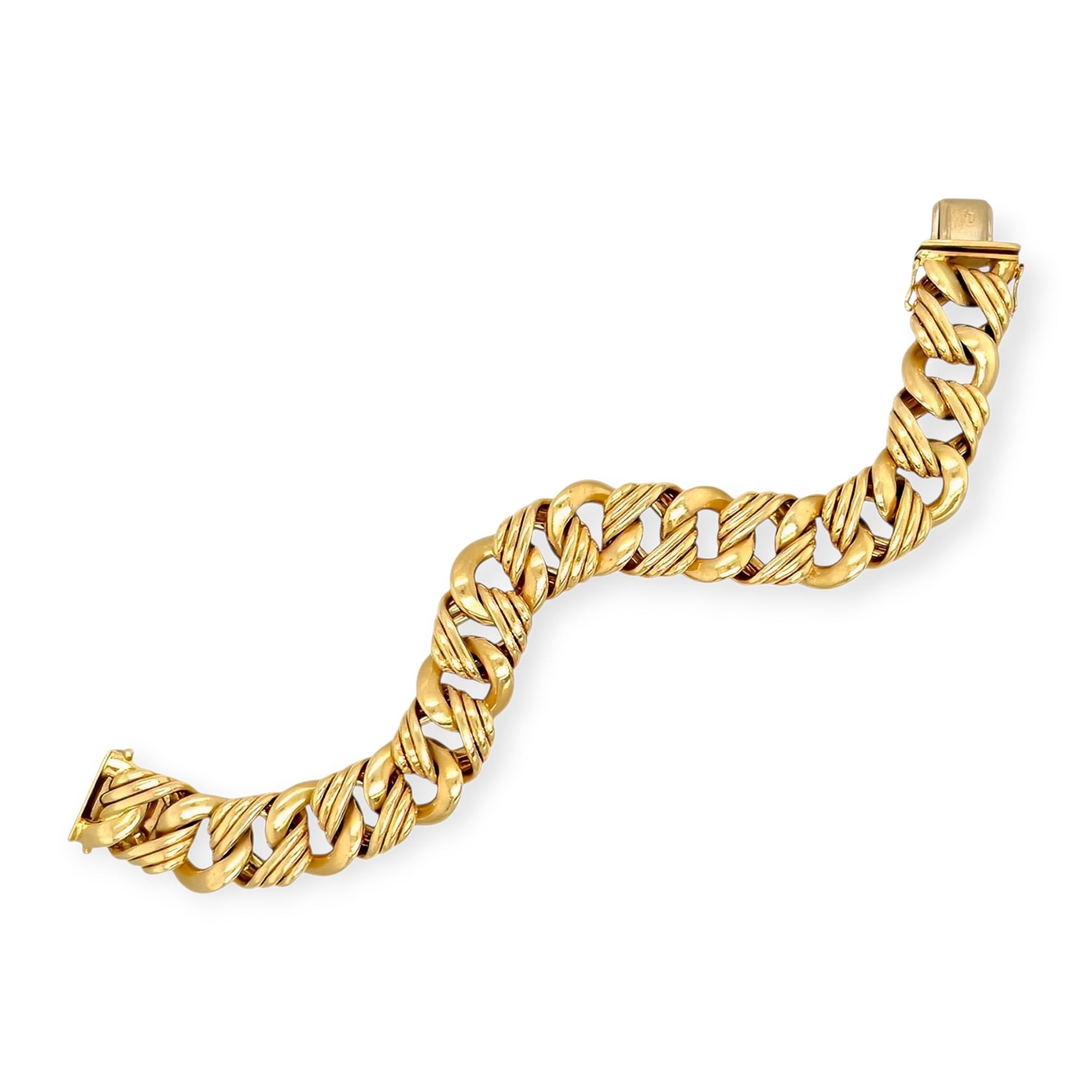 An 18 karat yellow gold bracelet, Tiffany & Co., Germany. Designed as a length of modified curb links alternating with fluted modified curb links. Signed Tiffany & Co., Germany.