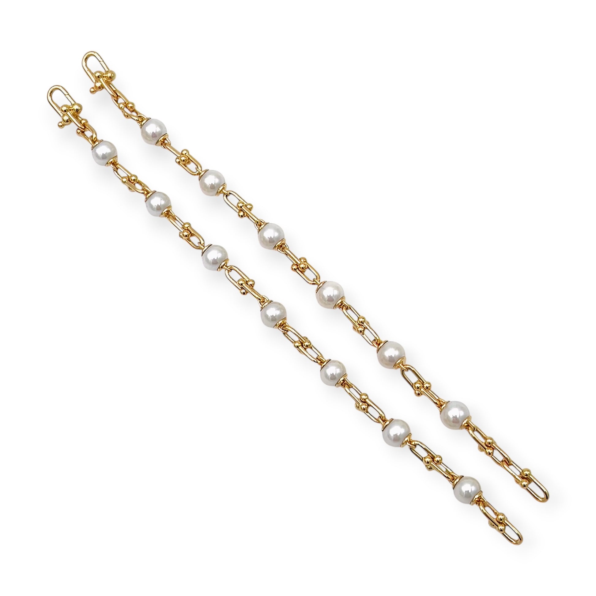 A pair of 18 karat yellow gold and pearl bracelets, Tiffany & Co., Italy. The first HardWear bracelet designed as seven pearls measuring approximately 8.5 mm connected by pairs of U shaped bracket links. The second bracelet of like design with six pearls. The bracelets can be attached to each other for wear as a necklace. Signed ©T&Co. Italy.