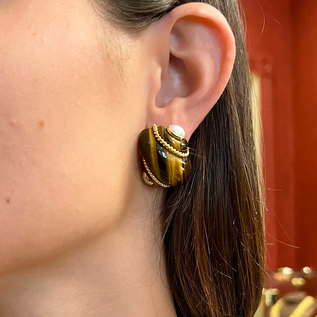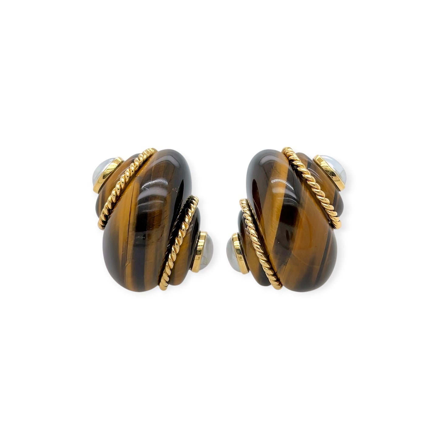 A pair of 18 karat yellow gold, tiger's eye and pearl earclips, Verdura. Each earclip designed as turbo shell of tiger's eye wrapped with gold ropework and studded with two bezel set pearl terminals.