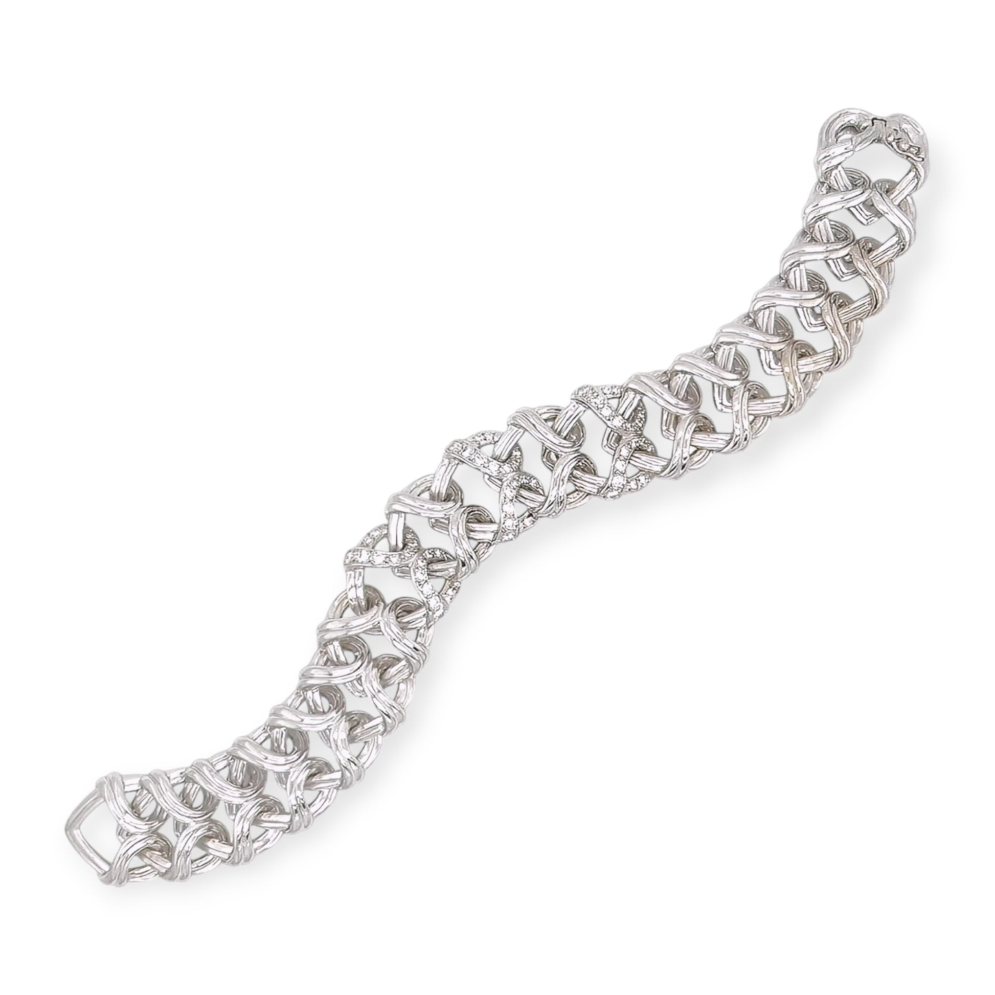 An 18 karat white gold, platinum and diamond bracelet, Verdura. The white gold bracelet designed as a length of interlocking heart motifs, the center three motifs enhanced with approximately 54 platinum set round brilliant cut diamonds. Signed and numbered.