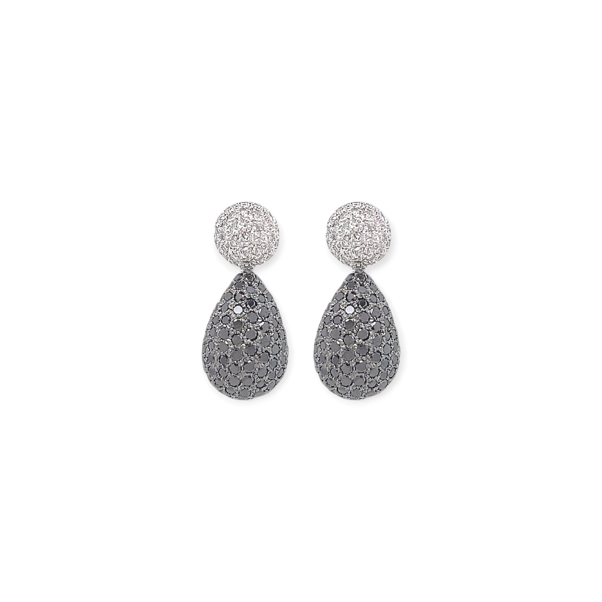 A pair of 18 karat white gold black and white diamond earpendants. Each with a circular top set with approximately 31 pave set white diamonds suspending a tear shaped drop set with approximately 68 pave set black diamonds, with post and friction back.
