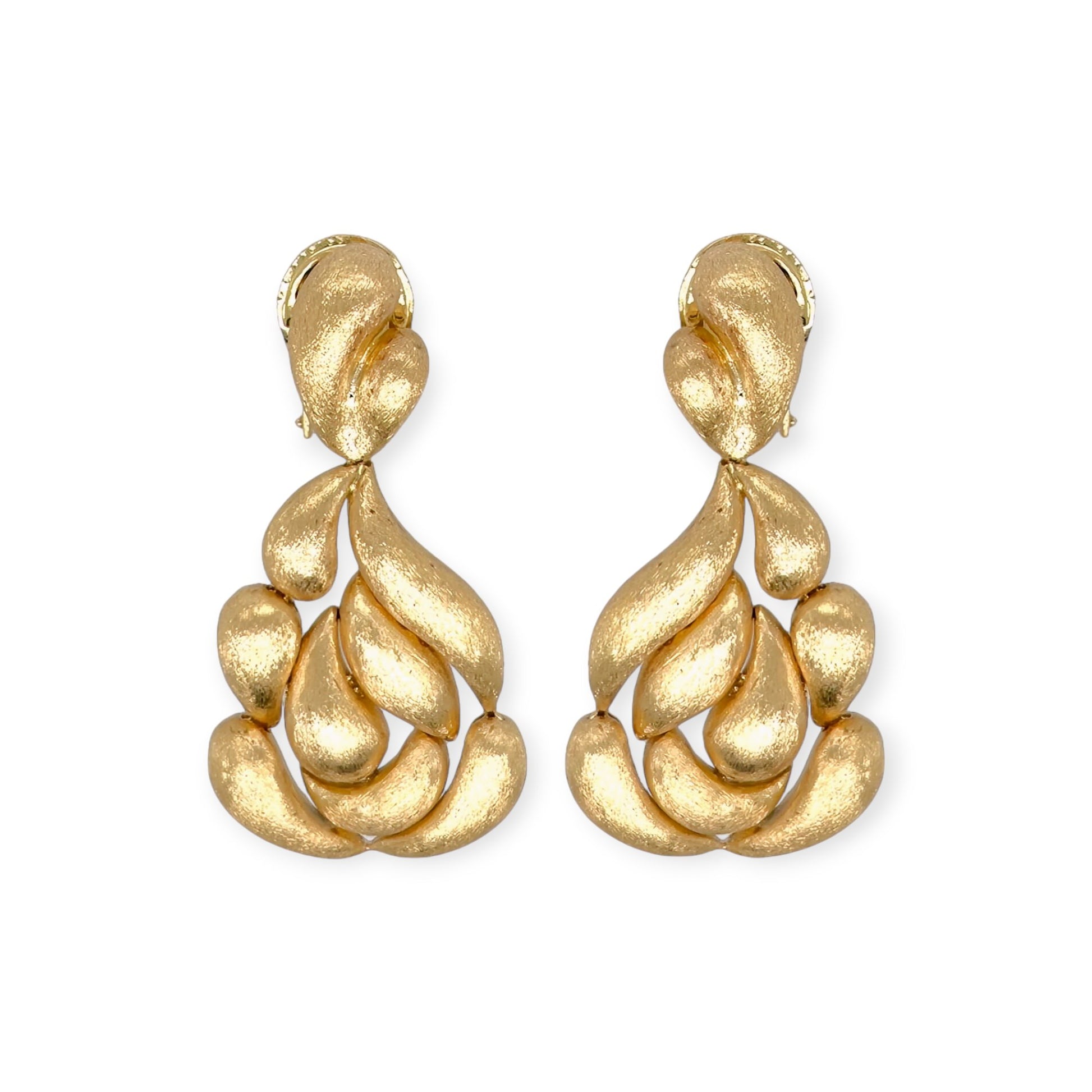 A pair of 18 karat yellow gold earclips, Yvel. Each brushed gold earclip designed as a two amorphous shapes joined at the bottom suspending a drop consisting of eight similarly amorphous shapes fitted together in a rounded triangle.