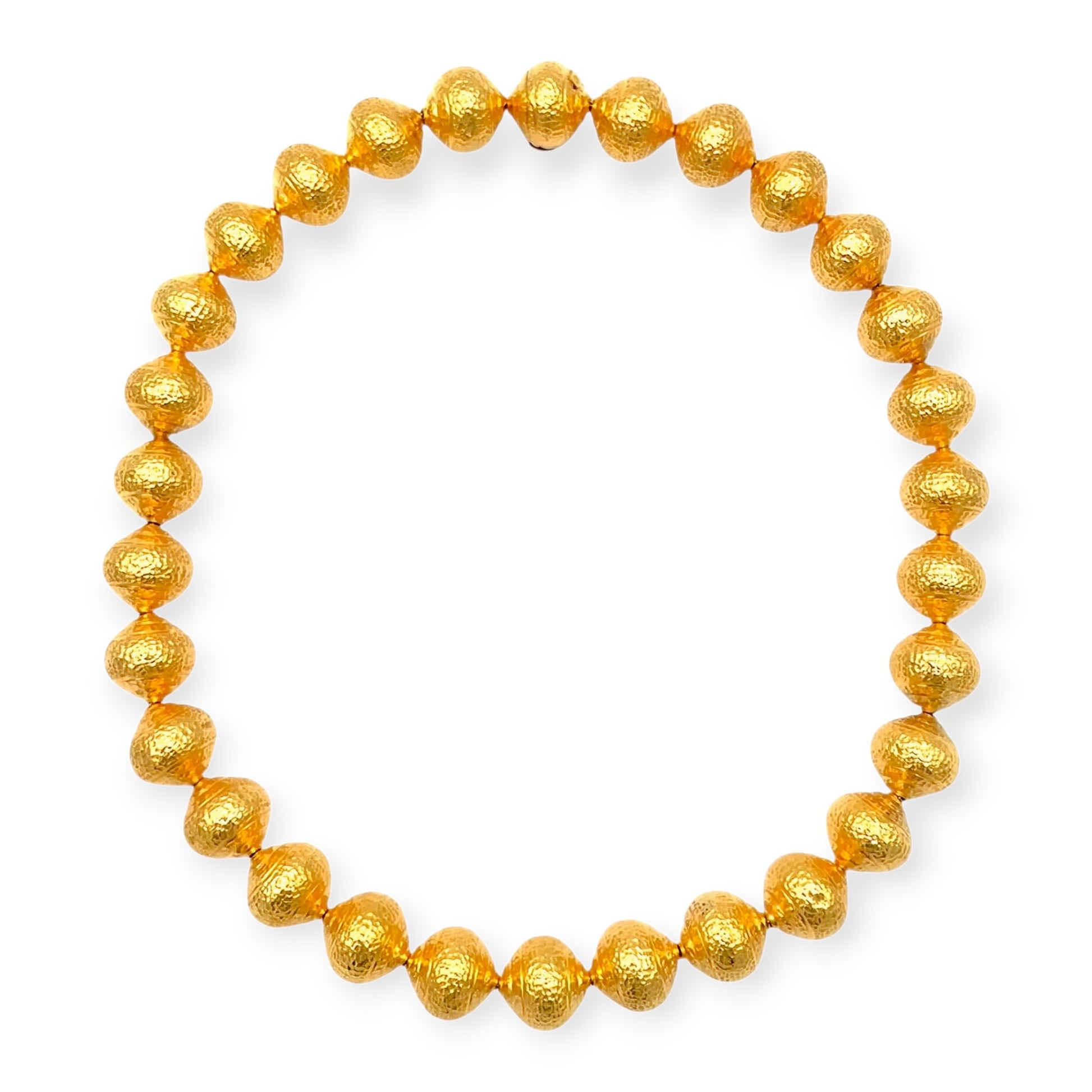 A 22 karat yellow gold bead necklace, Zolotas, Greece. Designed as a string of approximately 30 hammered gold beads measuring approximately 15 mm.